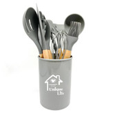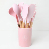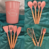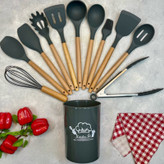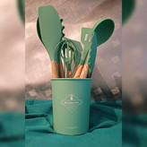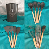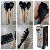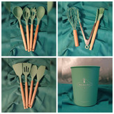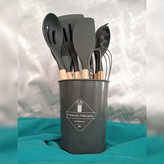 این محصول شامل یک استند برای نگهداری، یک همزن،کفگیر،ملاقه،فرچه،چنگال سالاد و 12 پارچه است. شامل 11 عدد ابزار و یک سطل برای گذاشتن ابزار داخل اون، دسته این ابزار از چوب بامبو اصل هست کاملا ضدآب و مقاوم 100درصد سیلیکونی هستند و کاملا نسوز